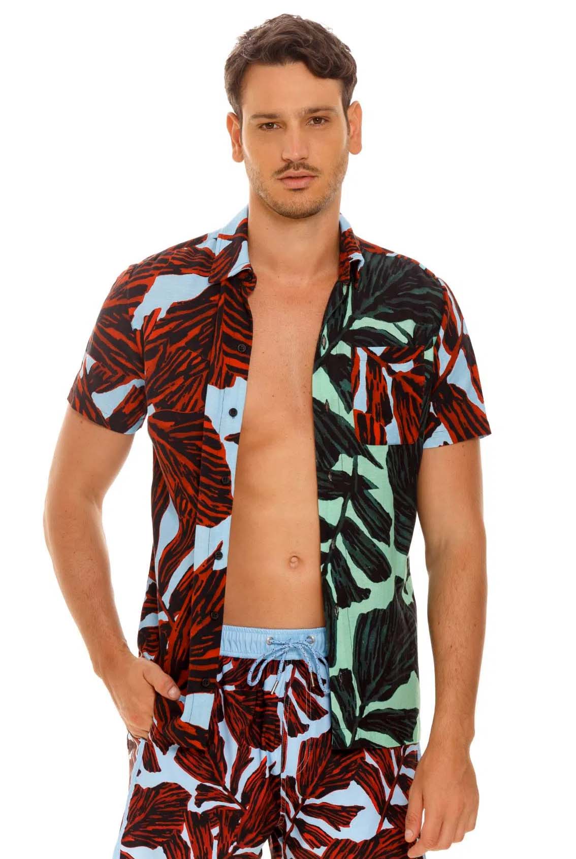 Esta camisa clásica para hombre se define por una mezcla tropical de flores y colores, y estampados diseñados a mano, con un bolsillo de parche para mayor funcionalidad.