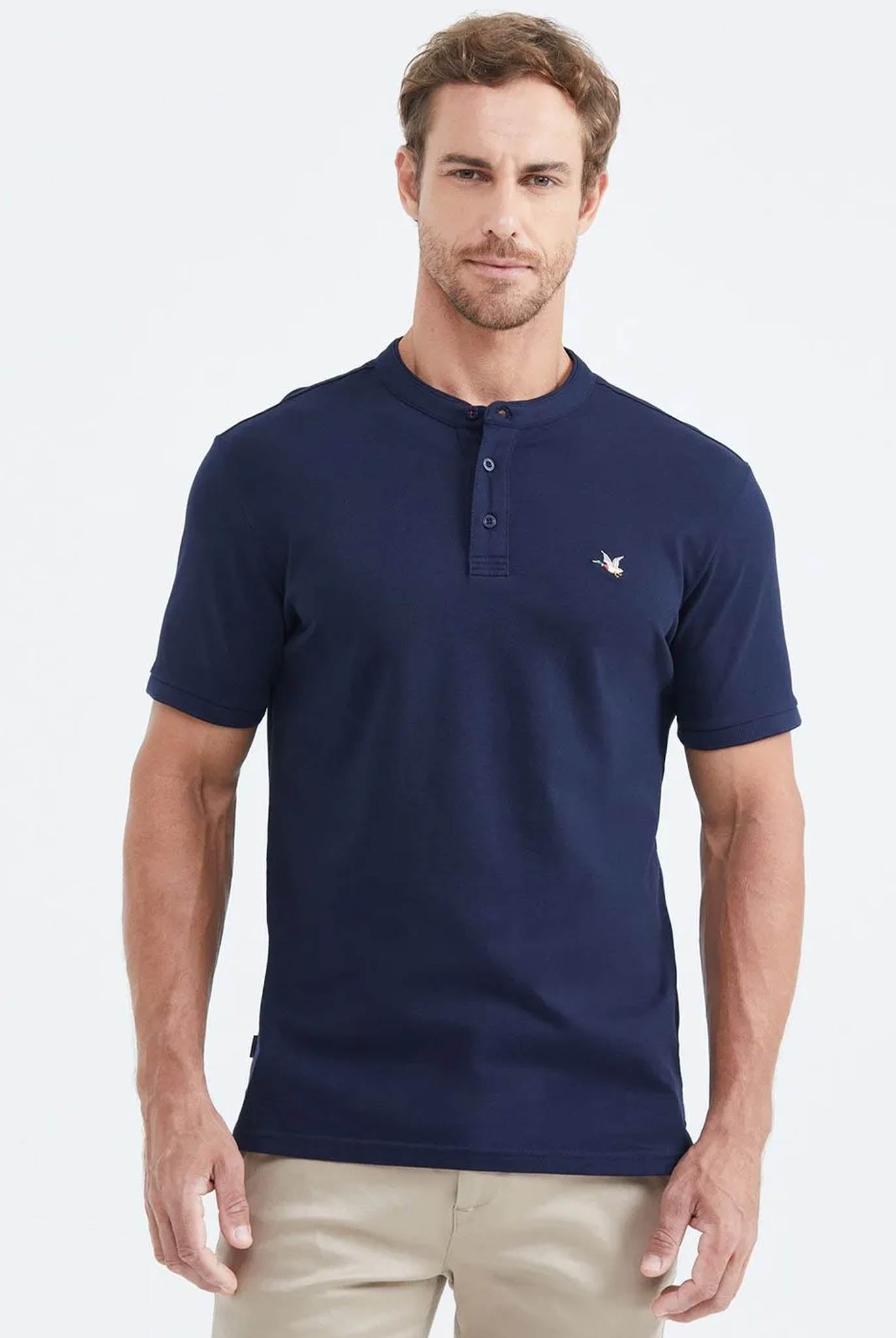 Camiseta para hombre tipo polo, Manga corta, cuello nerú con borde en textura jacquard y líneas en contraste, puños tejidos tono a tono y perilla corta de botones. Elaborada en piqué, en mezcla de algodón y elastano, material con patrón texturizado en relieve, buena elasticidad y transpirabilidad. Gráfico frontal, estampado tono a tono. Marquilla tejida en el costado. Las camisetas polo con cuello Nerú son una prenda estilizada, que se destaca por su cuello recto, ideal para un look casual y sofisticado.