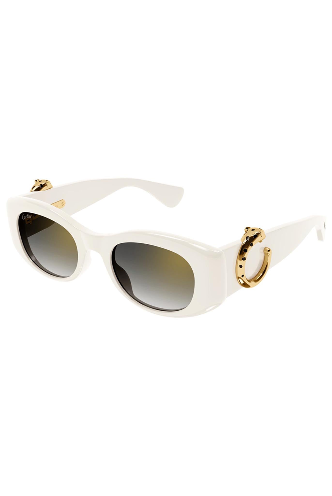 Nueva montura de acetato ultrafemenina inspirada en la colección de artículos de marroquinería con la Panthère C tridimensional adornando la varilla. Moderno diseño 'cat eye' estrecho, perfecto para un look elegante y moderno. El emblemático detalle de Panthère C decorado con manchas de esmalte hecho a mano funciona como firma joyera en las varillas. Precioso acabado en oro y acetato en sinergia con la colección de artículos de marroquinería. PANTHERE DE CARTIER |