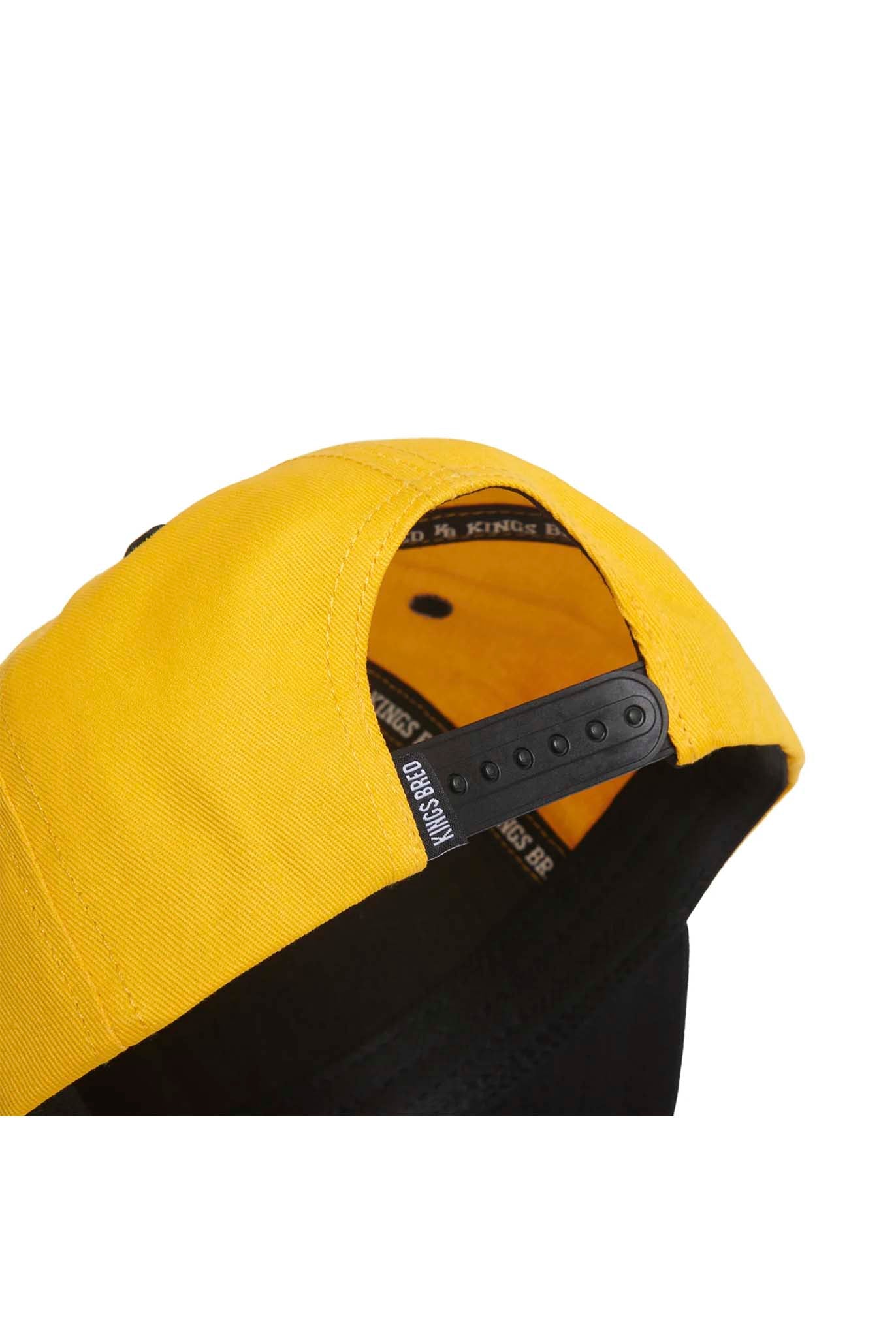 LA NACIÓN representa unidad, fuerza y poder. TODOS SOMOS UNO. La gorra con montura A y cierre a presión THE NATION presenta un cuerpo completo en color AMARILLO DORADO con visera NEGRA, visera NEGRA debajo, logotipo Kings Bred bordado en NEGRO, ojales NEGROS, cierre a presión NEGRO y detalles originales completos en el interior.
